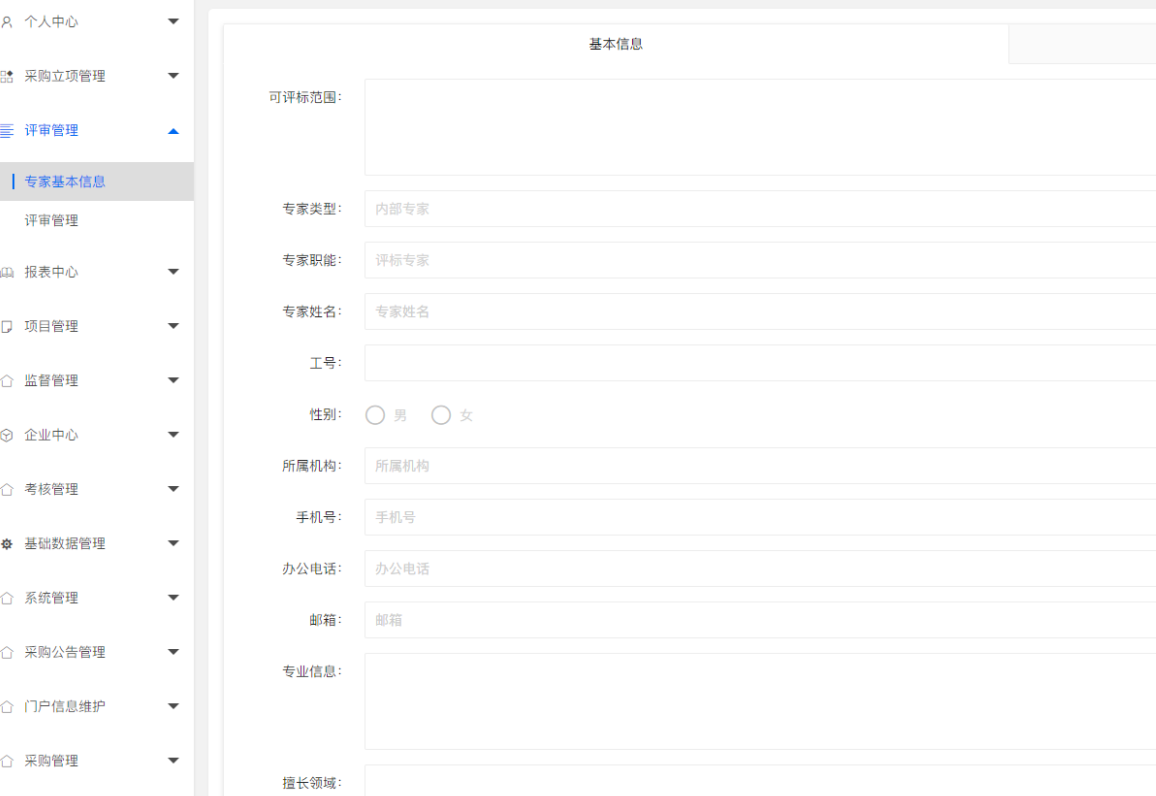 功能点:查询、维护基准价、组建评审小组、项目答疑澄清、文件费保证金审核、供应商报价维护、查看评审明细。