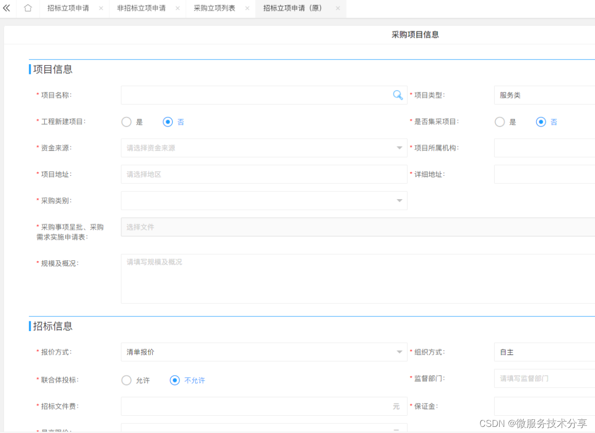 功能点:招标类项目立项申请入口,用户可以保存为草稿,提交。