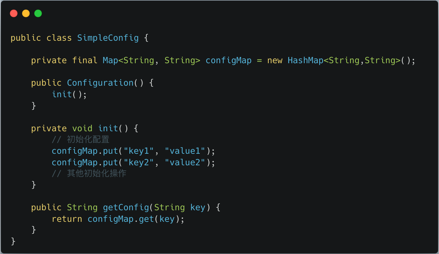 上图中显示一个非常简单的配置类 SimpleConfig ,内部有一个 HashMap 对象 configMap 。构造函数调用初始化方法,初始化方法内部的逻辑是:将配置数据存储到 HashMap 中。