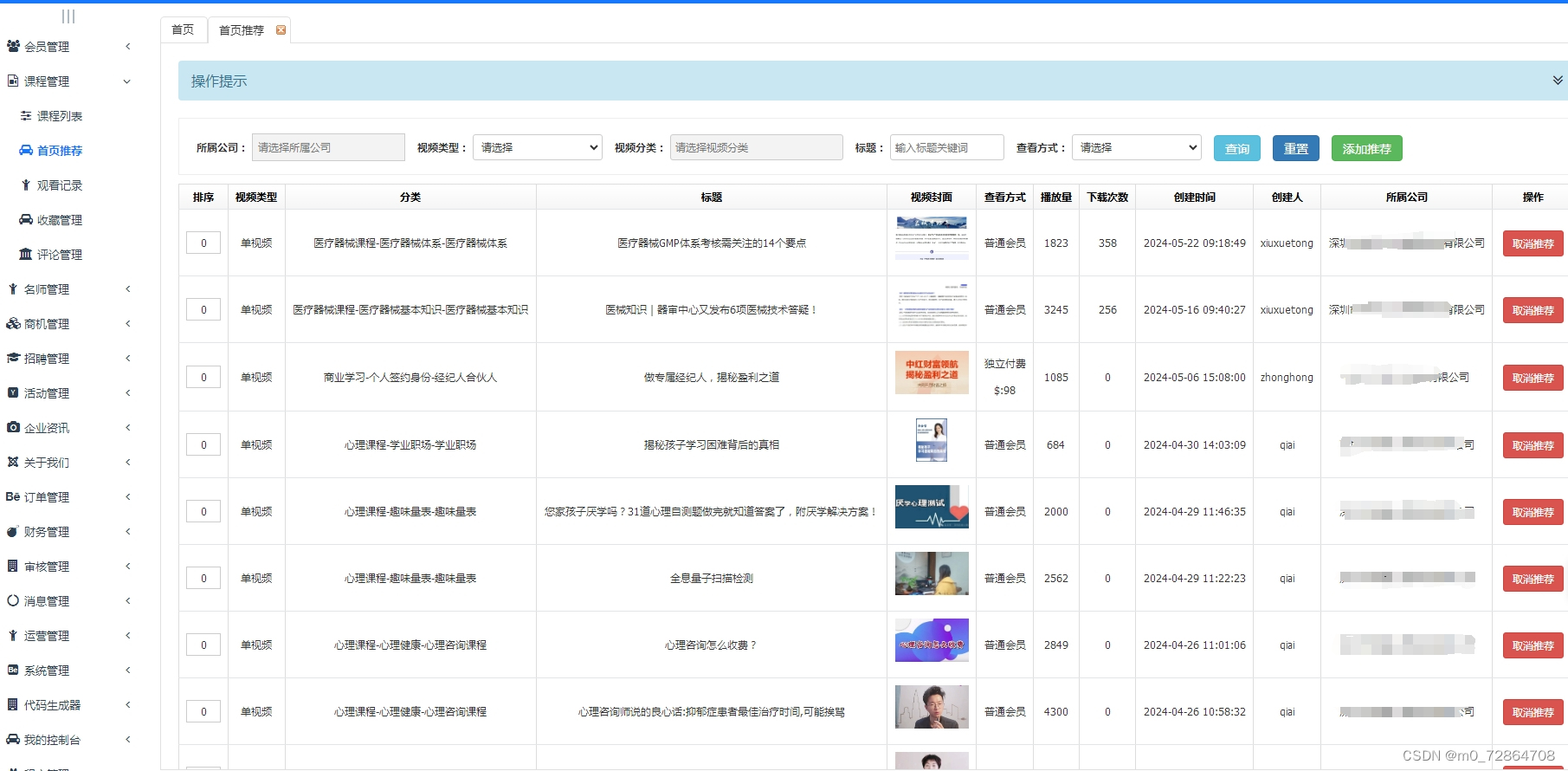 课程管理模块是平台的教学基石,包括课程列表、首页推荐、观看记录、收藏管理和评论管理。课程列表支持多维度查询、列表分页、课程管理、修改、删除、视频码、添加报告和系列课程等功能。首页推荐、观看记录、收藏管理和评论管理也支持多维度查询和列表分页,为用户提供个性化的学习体验。