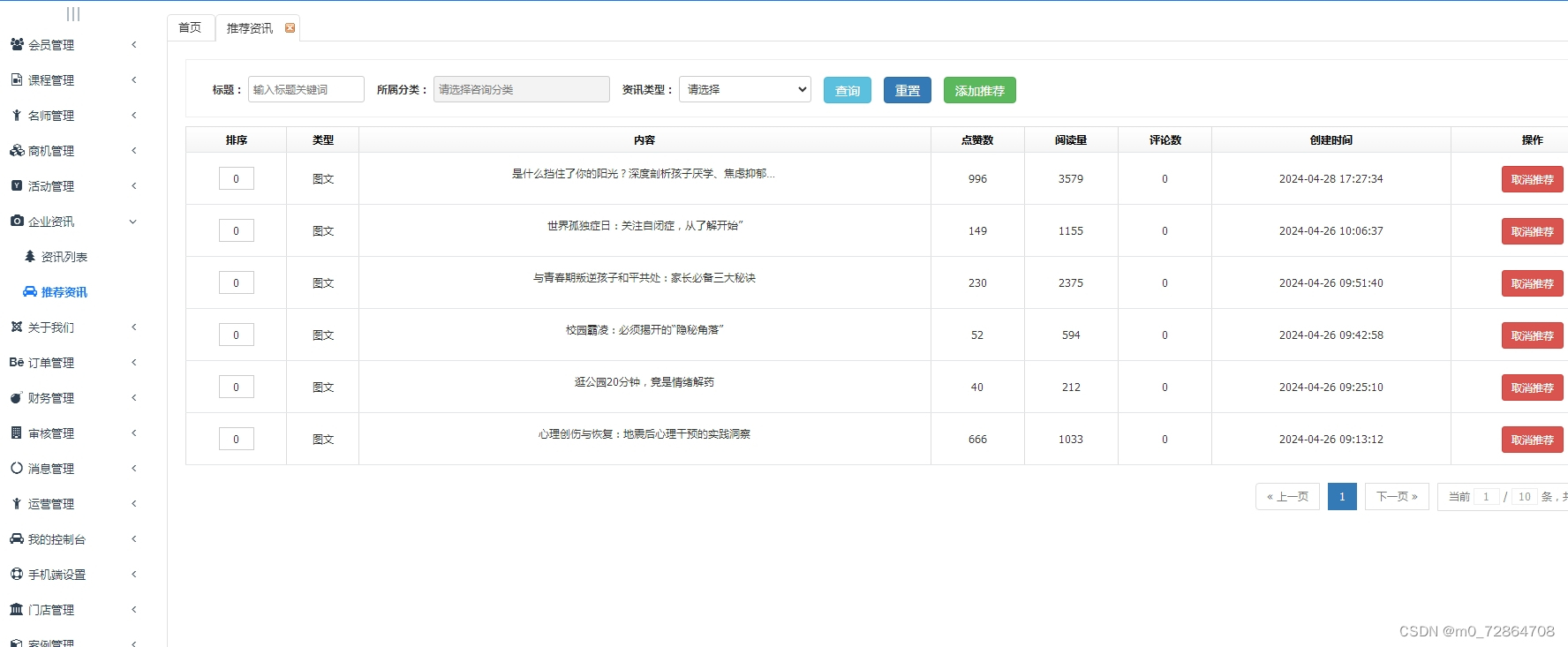 名师管理模块为用户提供了与行业专家互动的机会,包括名师列表、名师话题、首页推荐、名师收藏和评论管理。名师列表支持多维度查询、列表分页、修改和删除等功能。名师话题、首页推荐、名师收藏和评论管理同样支持多维度查询和列表分页,使用户能够轻松追踪心仪的名师及其最新动态。
