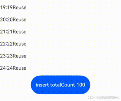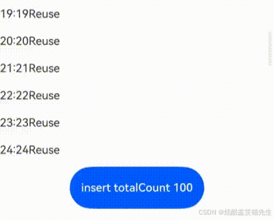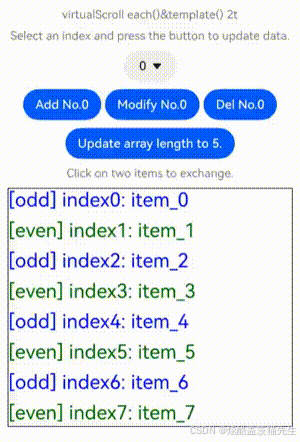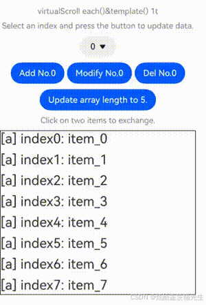 下面的代码设计了Repeat组件的virtualScroll场景典型数据源操作,包括插入数据、修改数据、删除数据、交换数据。点击下拉框选择index值,点击相应的按钮即可进行数据修改操作。依次点击数据项可以交换被点击的两个数据项。