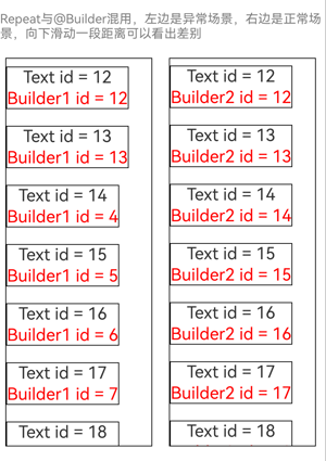 Text('Repeat与@Builder混用,左边是异常场景,右边是正常场景,向下滑动一段距离可以看出差别')