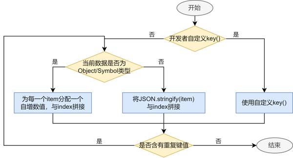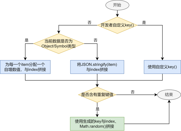 键值生成函数key()的目的是允许Repeat识别数组更改的细节:添加了哪些数据、删除了哪些数据,以及哪些数据改变了位置(索引)。