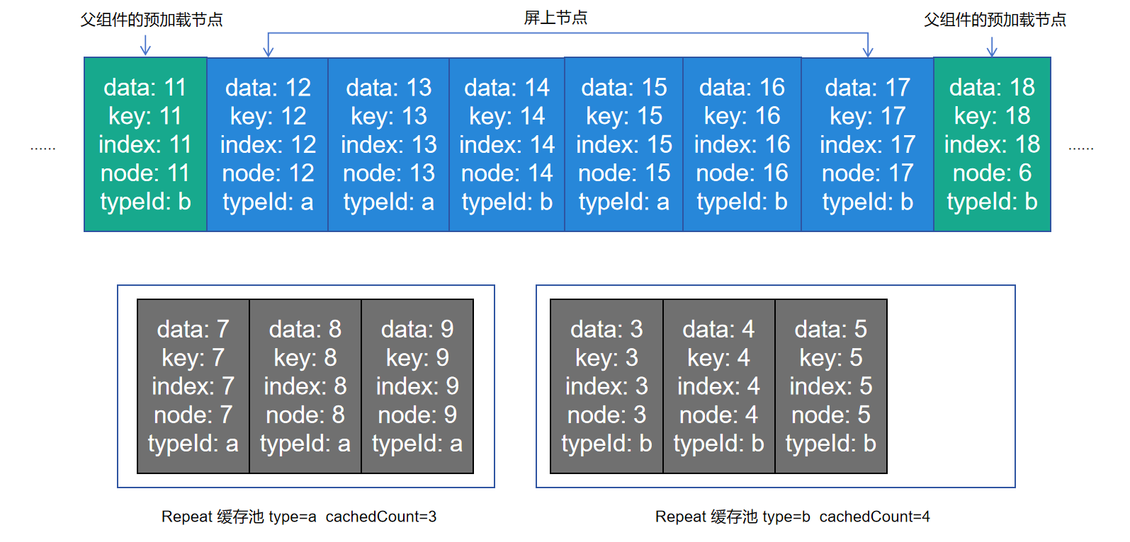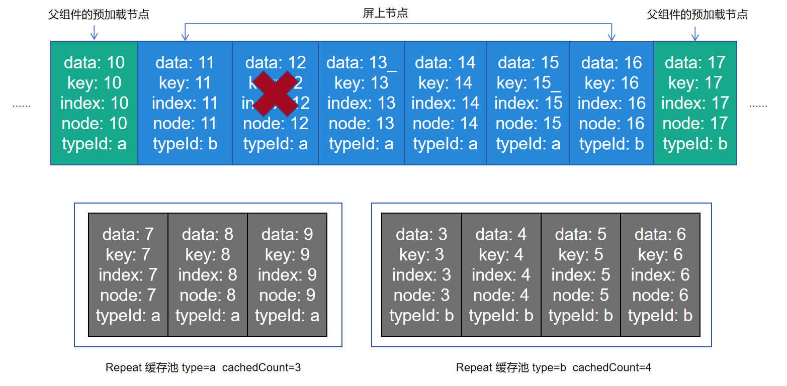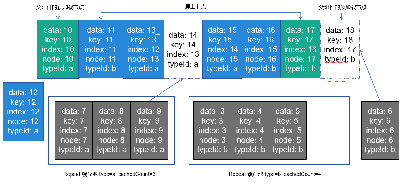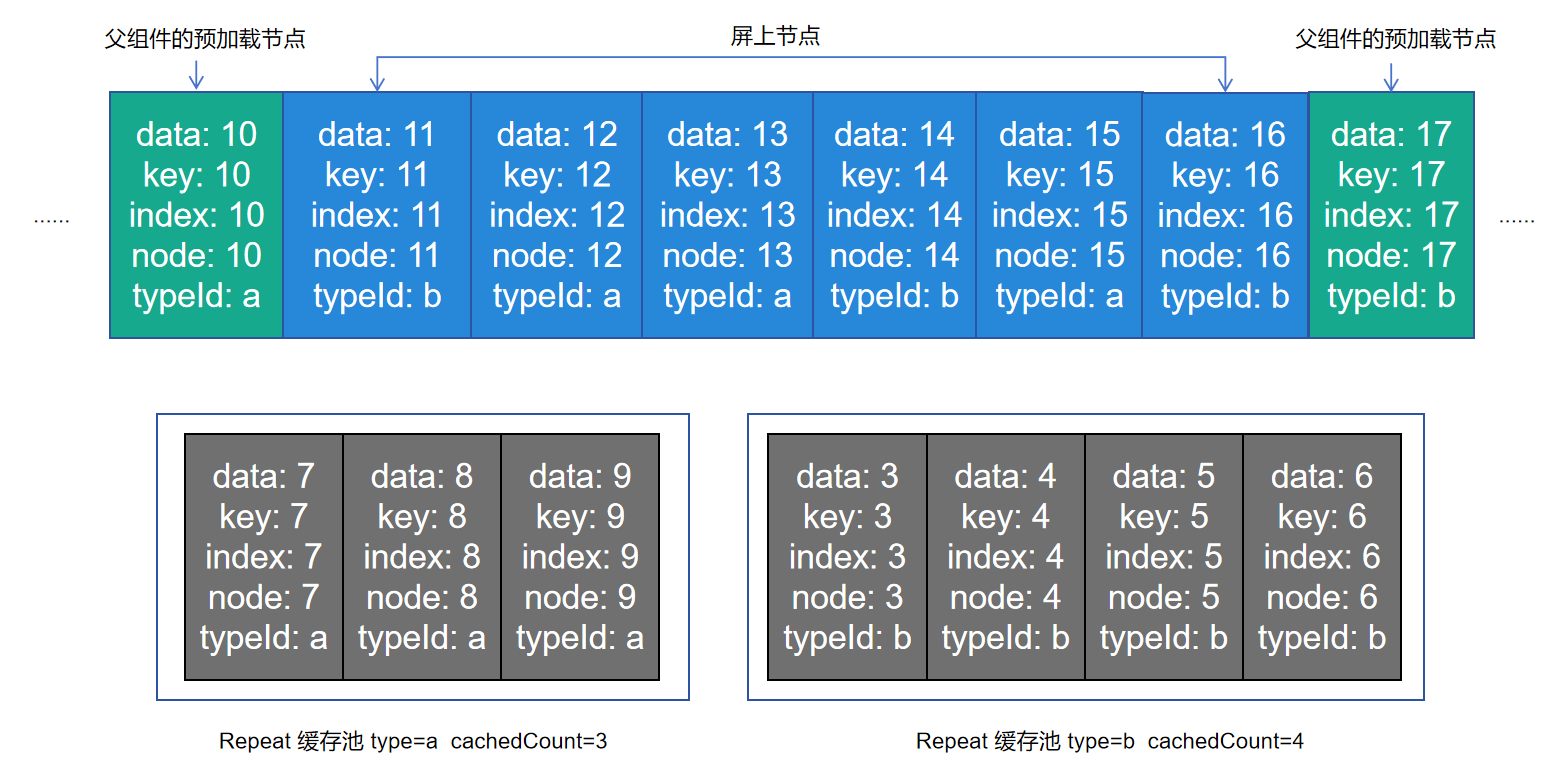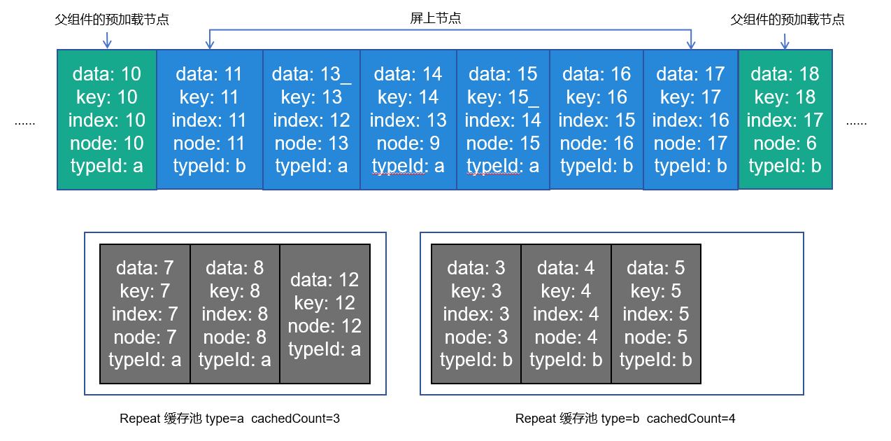 - Repeat cachedCount: 是指Repeat视为“不可见”的节点,这些节点是空闲的,框架会暂时保存,在需要使用的时候更新这些节点,从而实现复用。