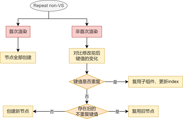 在Repeat组件进行数据更新时,它会依次对比上次的所有键值和本次更新之后的区别。若当前键值和上次的某一项键值相同,Repeat会直接复用子组件并对RepeatItem.index索引做对应的更新。