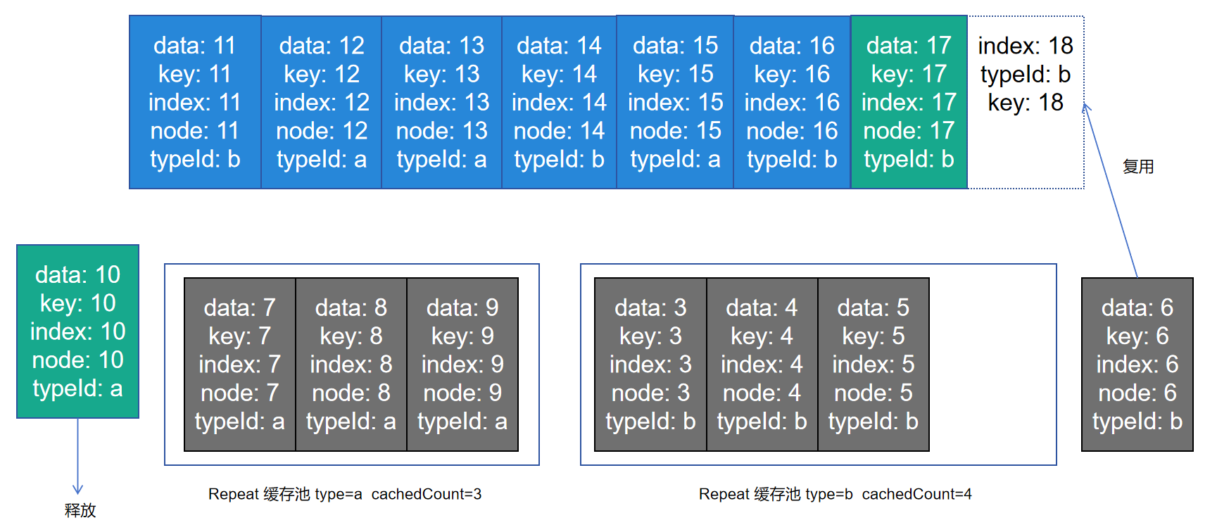 上图显示node13节点更新了数据data和index;node14更新了templateId和index,于是从缓存池中取走一个复用;node15由于key值发生变化并且templateId不变,复用自身节点并同步更新key、index、data;node16和node17均只更新index。index=17的节点是新的,从缓存池中复用。