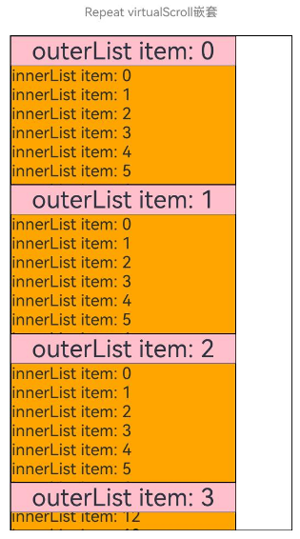 - Repeat开启virtualScroll后,在每次迭代中,必须创建且只允许创建一个子组件。不开启virtualScroll没有该限制。生成的子组件必须是允许包含在Repeat父容器组件中的子组件。