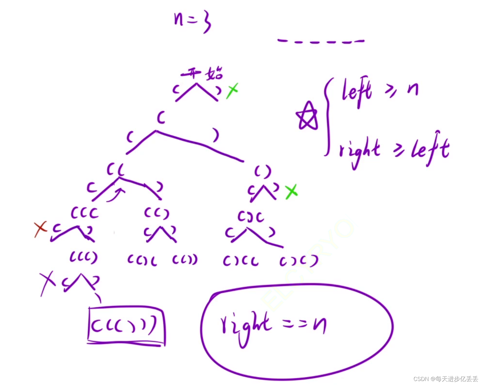 current: 存储当前构建的括号序列的字符串。step: 当前需要填入的位置(即current字符串的长度)。left: 当前状态的字符串中已放置的左括号数量。