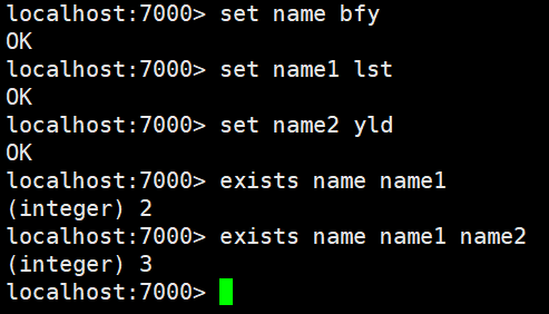 作用: 检查给定key 是否存在。多个key之间使用空格隔开,只要有一个key存在,返回值就是1 新版本中会提示几个键存在
