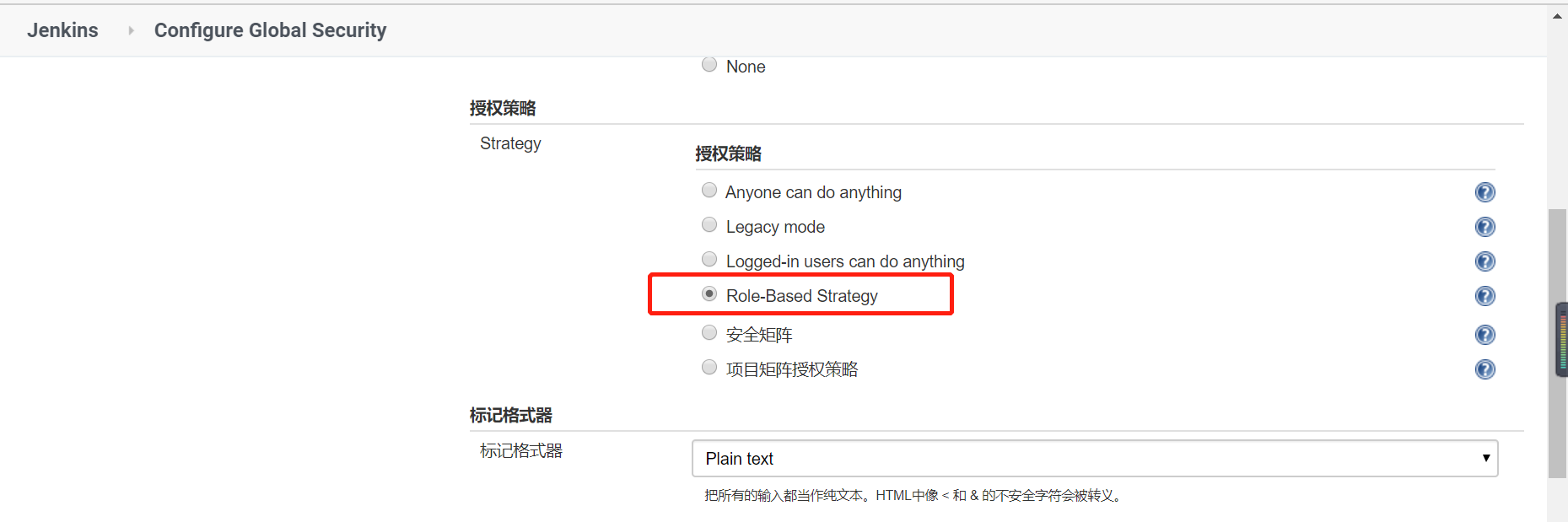 安装好 Role-based Authorization Strategy 插件之后,全局安全设置中就可以找到对应的授权策略:Role-Base Strategy。