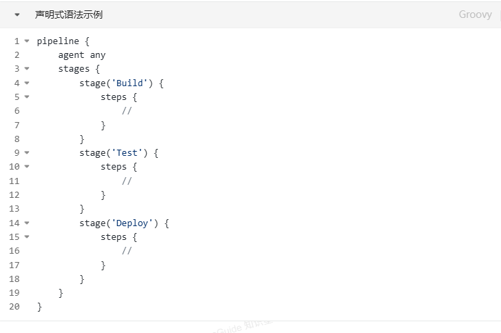 ●Scripted Pipeline(脚本式):通常基于 Groovy 写,可以为用户提供巨大的灵活性和可扩展性,但语法复杂一些。