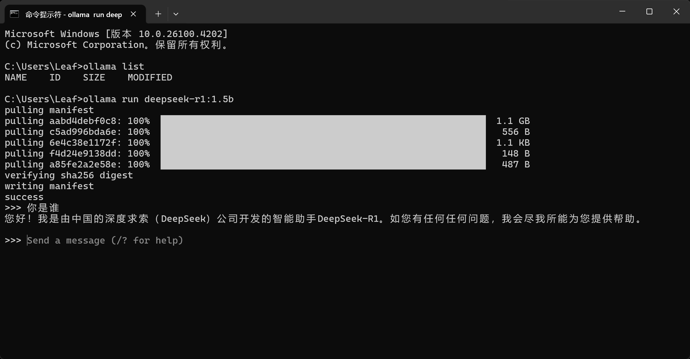 安装一个模型进行测试,通过ollama run 命令进行安装,指定安装模型的名字和版本,可以直接去官网查看对应模型的安装命令。