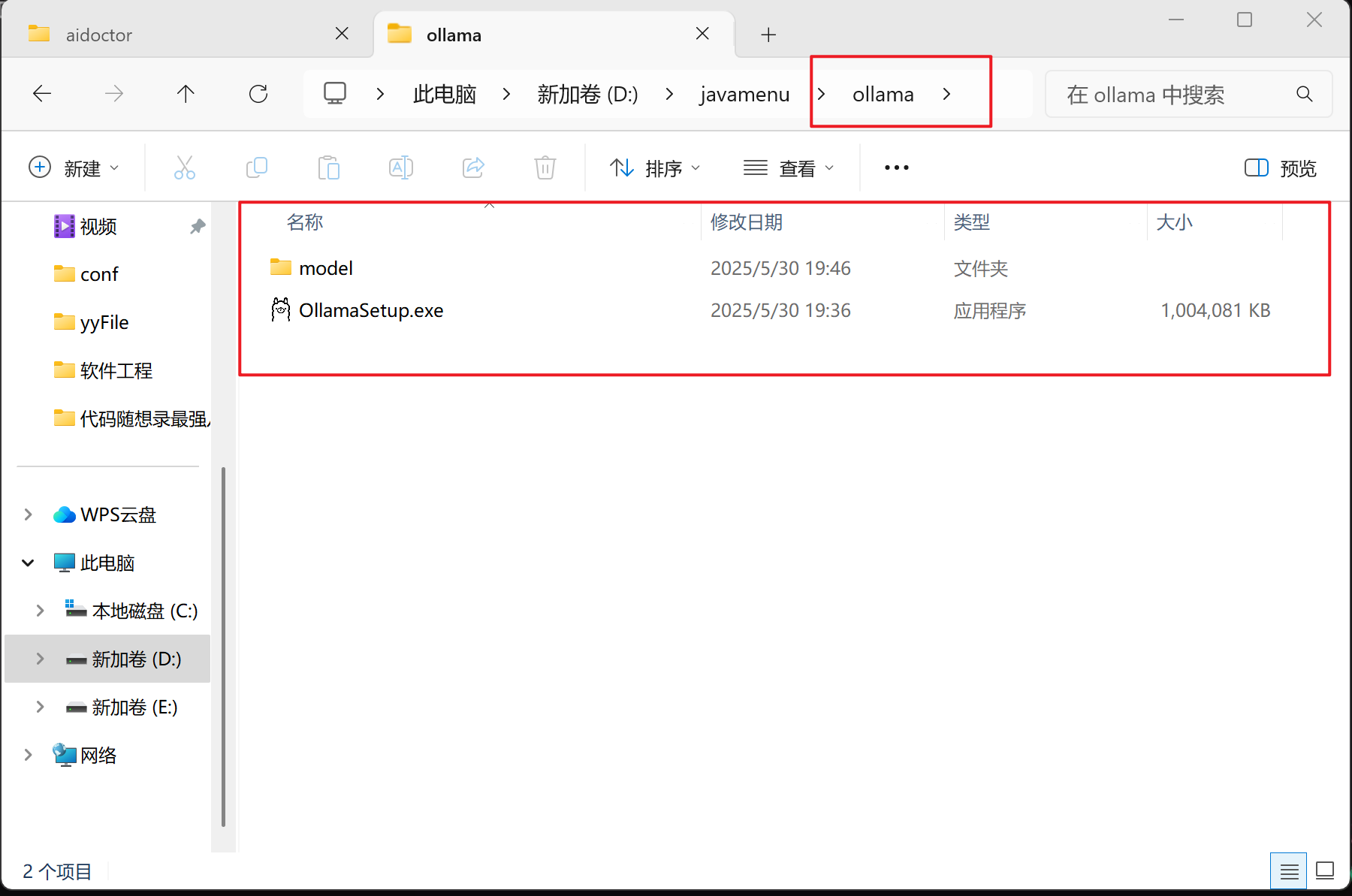 在其他盘创建一个目录,进行安装ollama,model是预留给安装模型的目录,这里不用管。