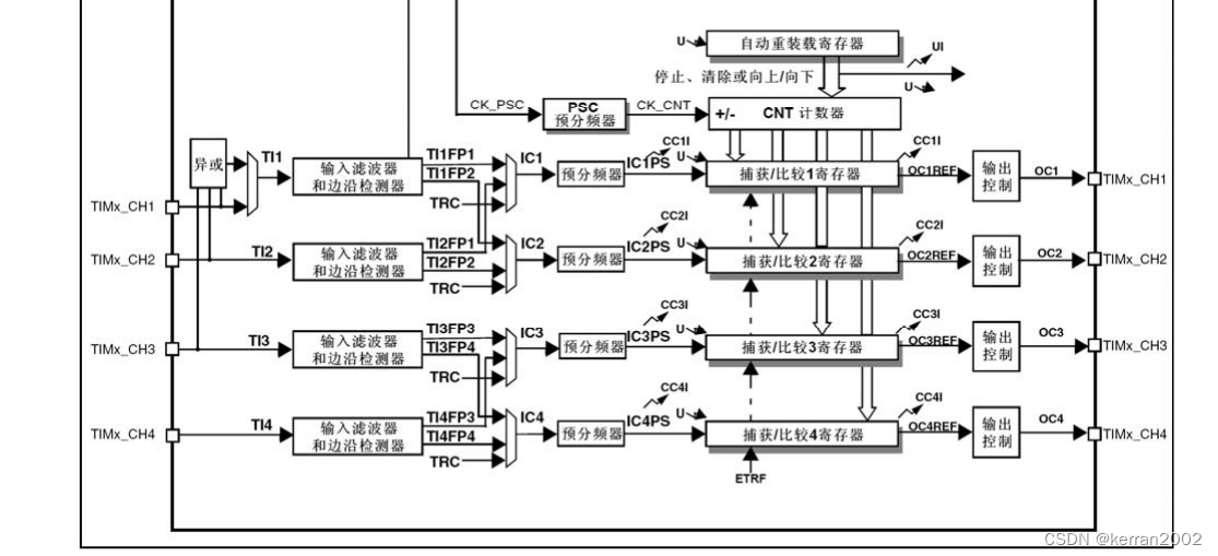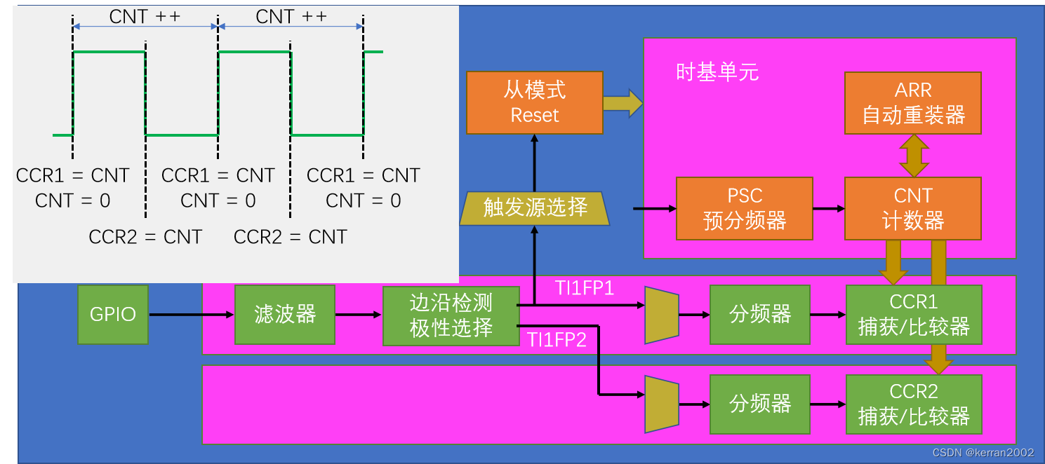 TIMx_CH1和TIMx_CH2可同时接入同一捕获寄存器测量不同参数。由TIxFPy进行配置,表示由通道x输入至通道y的捕获寄存器。