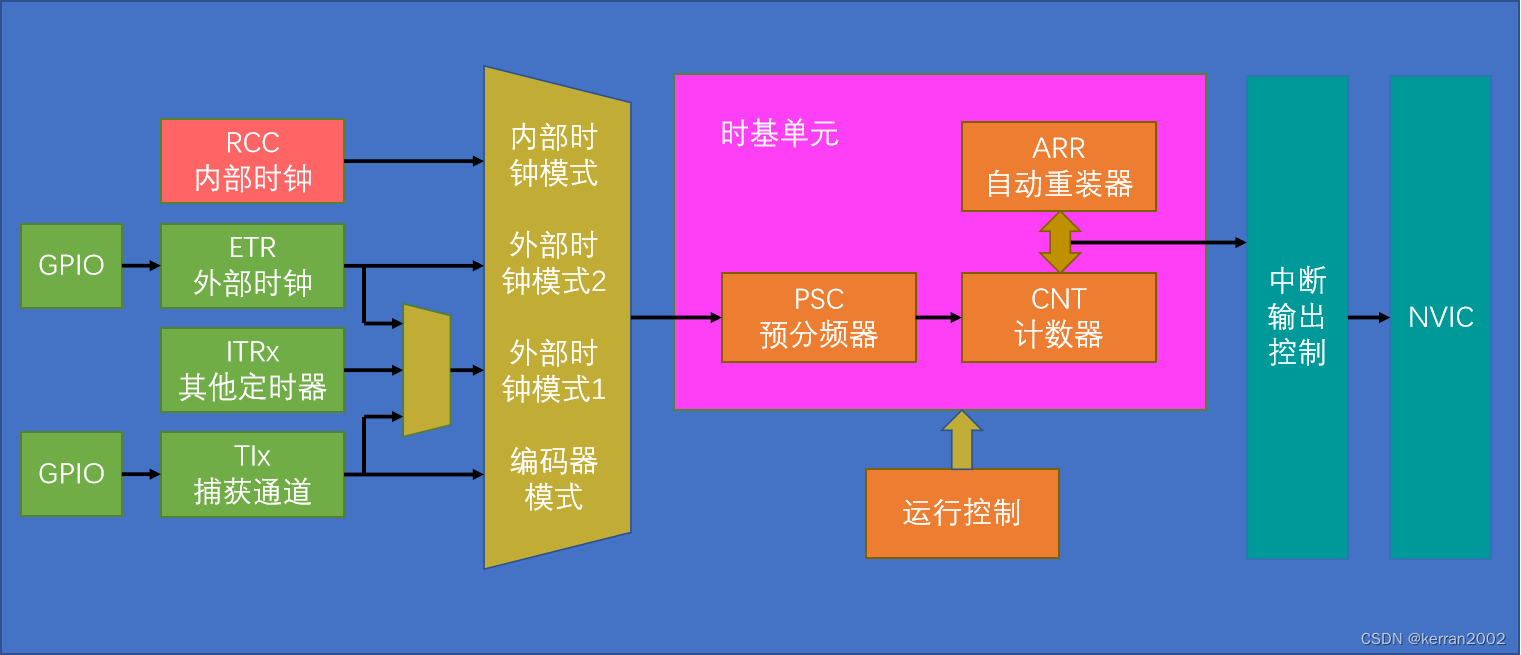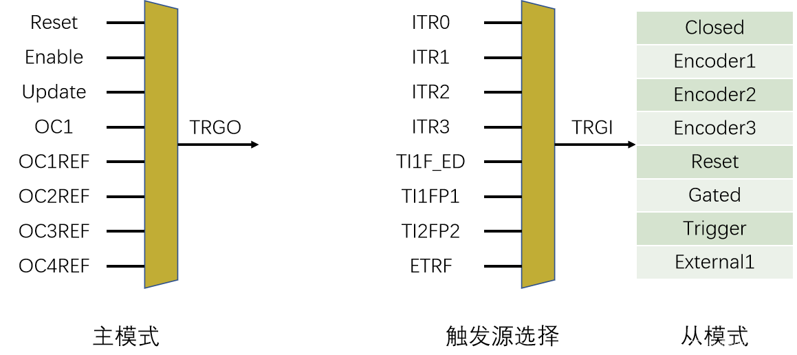 从模式:就是接收其他外设或者自身外设一些信号,用于控制自身定时器的运行,也就是被别的信号控制。