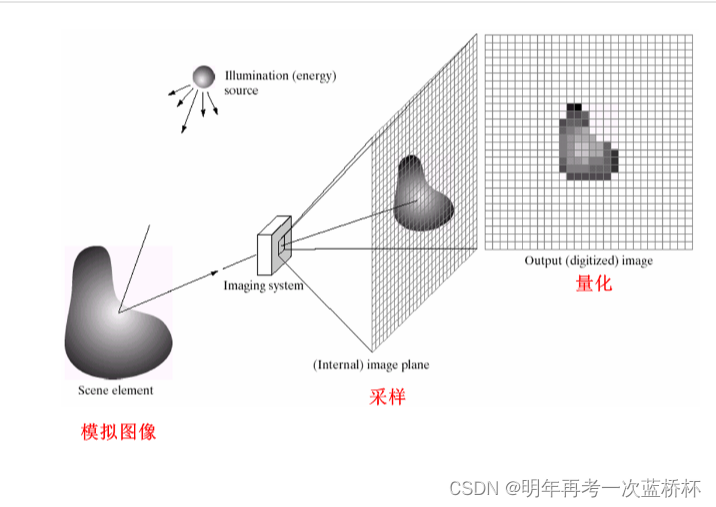 就比如上面这张图,可以看出,采样是图像空间坐标的数字化,而量化是图像灰度值的数字化。