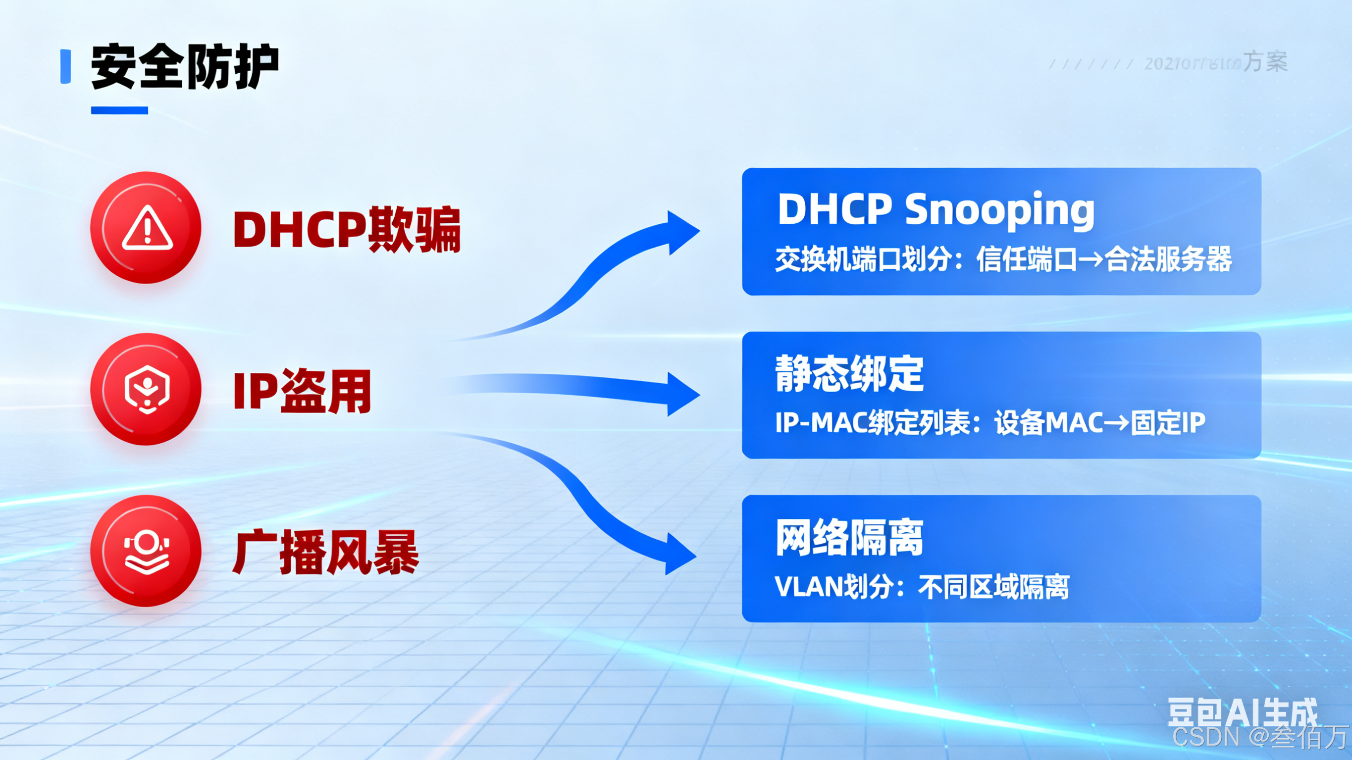 网络隔离是一种通过将网络划分为多个相对独立的区域,从而降低安全风险和减少攻击影响范围的重要策略 。在应对 DHCP 相关的安全问题时,使用 VLAN(虚拟局域网)或子网隔离设备是两种常见且有效的网络隔离方法 。