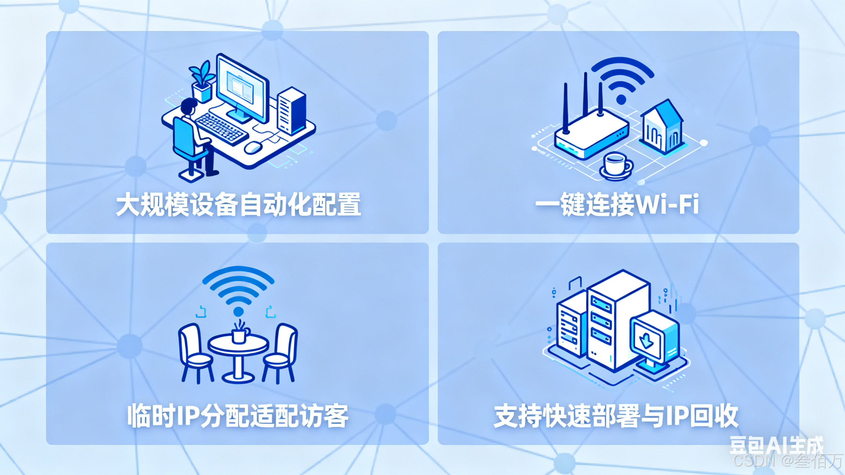 在咖啡馆、酒店、机场等公共场所,公共 Wi-Fi 已经成为人们日常生活中不可或缺的一部分 。对于这些场所的运营者来说,如何让大量的访客设备快速、便捷地接入网络,同时又能确保网络的安全和稳定,是一个需要解决的重要问题 。而 DHCP 在公共 Wi-Fi 环境中,扮演着关键的角色,为访客网络的便捷接入提供了有力支持 。