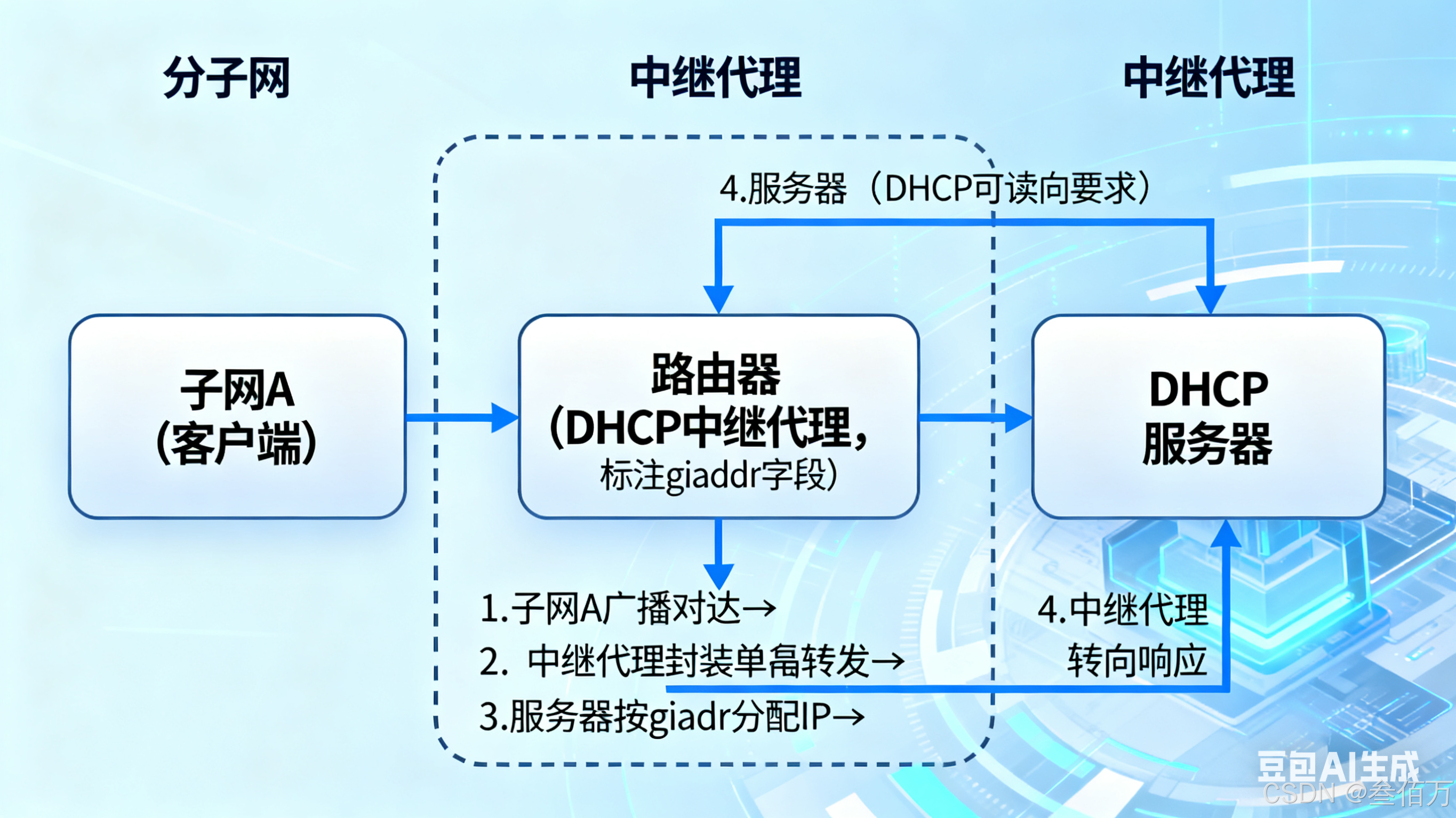 在复杂的大型网络环境中,往往存在多个子网,就像一座大城市被划分成了许多不同的区域。而 DHCP 支持中继代理的特性,就像是在这些不同区域(子网)之间搭建了一座桥梁,让 DHCP 服务器能够跨越子网的界限,为不同子网中的设备提供 IP 地址分配服务 。