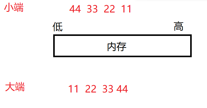 上面这张图就是小端存储,44是高位,他存储在了内存的低地址,11是数据的低位,存储在内存的高地址处。