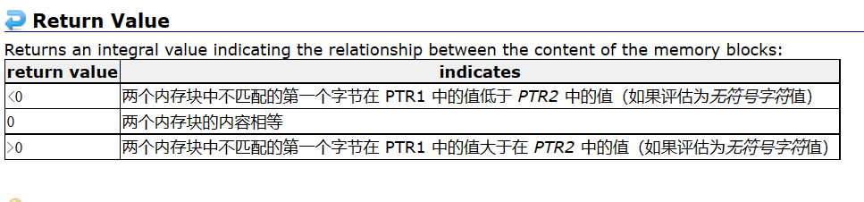 int strcmp ( const char * str1, const char * str2 );将str1与str2中的每个对应字符的ascii值相比,比较到出现另个字符不一样或者一个字符串结束或者所有个字符全部比较完。