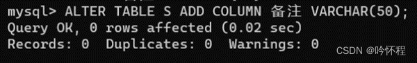 5、使用 SQL 语句 ALTER TABLE 为 S 表添加一个名为“备注”的数据列,其数据类型为 varchar(50)。