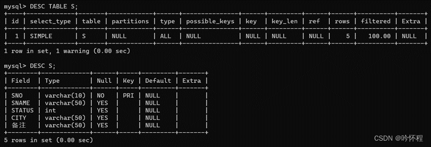 关于第二个发现,是由于误操作多输入一个table,发现前者是关于表本身的描述,而后者是关于表结构信息的描述。但仔细一瞅,觉得有些奇怪,找到的资料说这是查询执行计划,“是数据库系统在执行查询时生成的一种表示查询执行方式的信息。执行计划提供了有关查询的详细信息,包括查询涉及的表、连接类型、使用的索引、扫描行数等等。这些信息对于优化查询性能和调试查询问题非常有用。”不大明白,那好吧,就暂时如此这般吧。