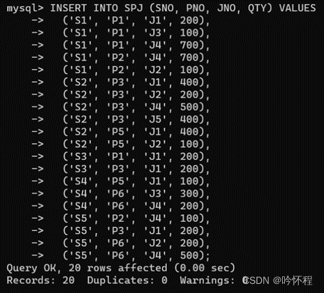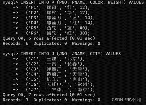 4、使用 SQL 语句 INSERT 向 SPJ数据库中的数据表S,P,J,SPJ插入数据。