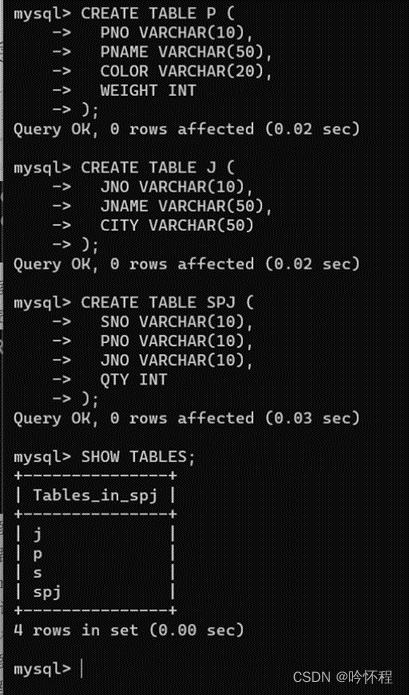 3、使用 SQL 语句在SPJ数据库中创建4个数据表:S,P,J,SPJ,不用定义实体完整性和参照完整性,待讲完有关概念后再练习。