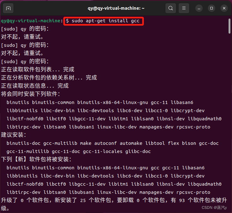 按下【Ctrl+Alt+T】在桌面打开命令行→输入命令【sudo apt-get install gcc】。另外,下载前要求输入系统密码,但是怎么输入都无法显示。经搜索发现,输入不显示是为了密码安全。虽然没有显示在屏幕上,但数字确实输进去了,输完密码按回车键就可以了,如图7所示。
