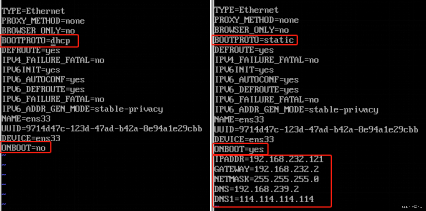 输入【vi ifcfg-ens33】编辑网络配置文件→如图10,红框为需要修改的部分。注意,在Vim编辑器中,按下小写字母o键,Vim将在当前行的下方插入一个新行,并进入插入模式;按小写字母i键进入插入模式;按Esc退出插入模式;按下“Shift”和两次“Z”键(也就是“ZZ”),即可保存并退出Vim编辑器。