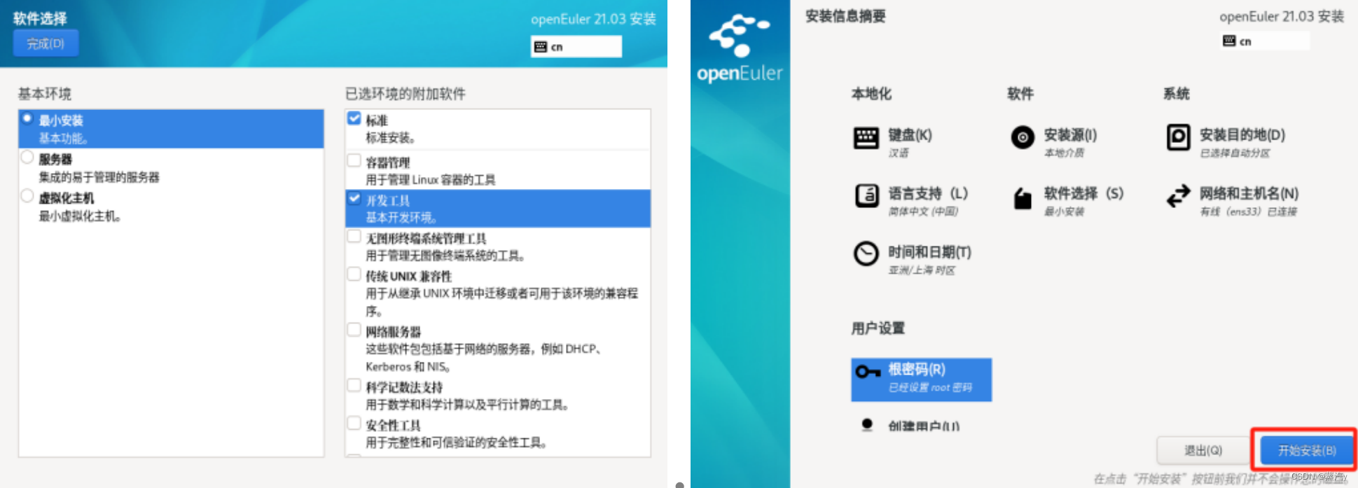 接下来安装openEuler系统。【开启此虚拟机】→选择语言【简体中文(中国)】→【安装目的地】→【本地标准磁盘】→【软件选择】→勾选【标准】和【开发工具】→【用户设置】设置root密码,点击【继续】→等待系统安装,这可能需要花费较长的时间。