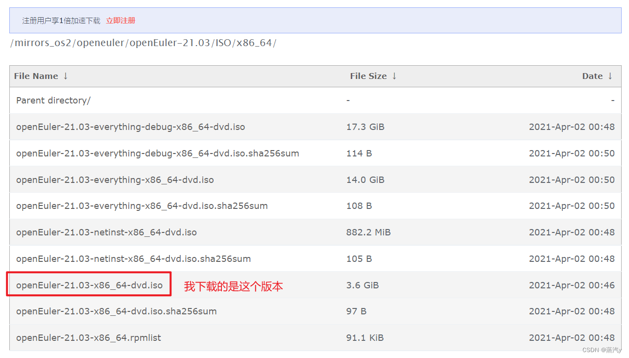 在openEuler的官网下载速度非常慢,因此我选择在华为云:https://repo.huaweicloud.com/openeuler/openEuler-21.03/ISO/x86_64/下载创新版本21.03,如图1所示。