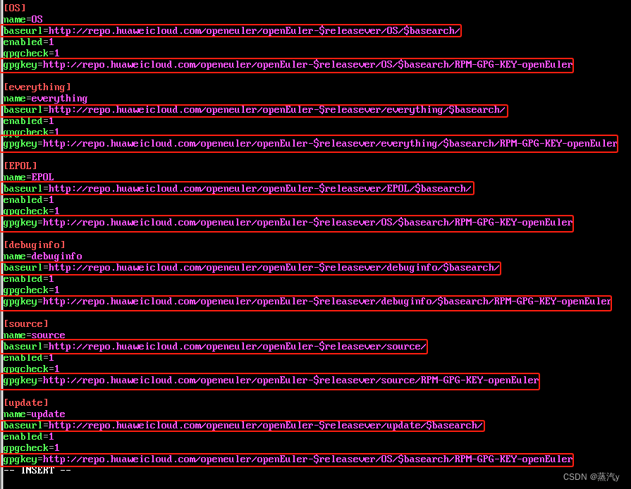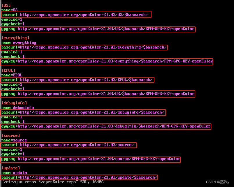 输入【vim /etc/yum.repos.d/openEuler.repo】配置openEuler软件源仓库。仓库如图12所示。