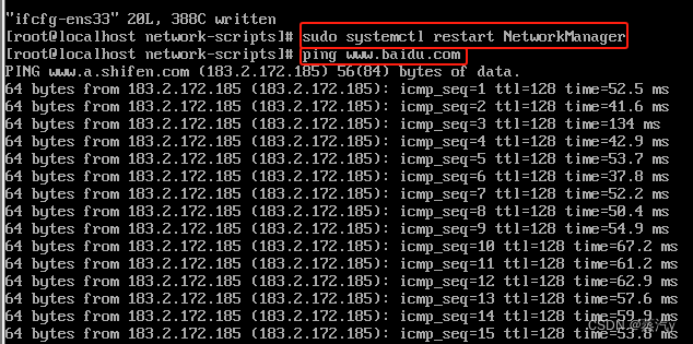 输入【sudo systemctl restart NetworkManager】重启NetworkManager 管理网络→输入【ping www.baidu.com】测试网络是否连接成功,如图11所示。