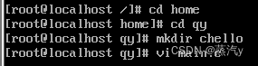 输入【cd home】【cd qy】进入想要创建c语言文件的文件夹→输入【mkdir hello】创建名为“hello”的文件夹→利用vi新建c语言文件【vi main.c】,如图16所示。