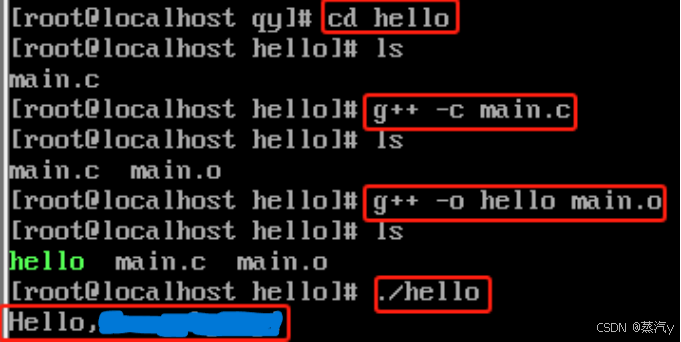 【cd hello】进入到c语言文件所在目录→【ls】查看文件情况→【g++ -c main.c】编译源文件→【ls】可见已生成“main.o”文件→【g++ -o hello main.o】生成名为“hello”的可执行文件→【ls】可见已成功生成文件→【./hello】运行可执行文件,成功打印“Hello,名字”,如图19所示。