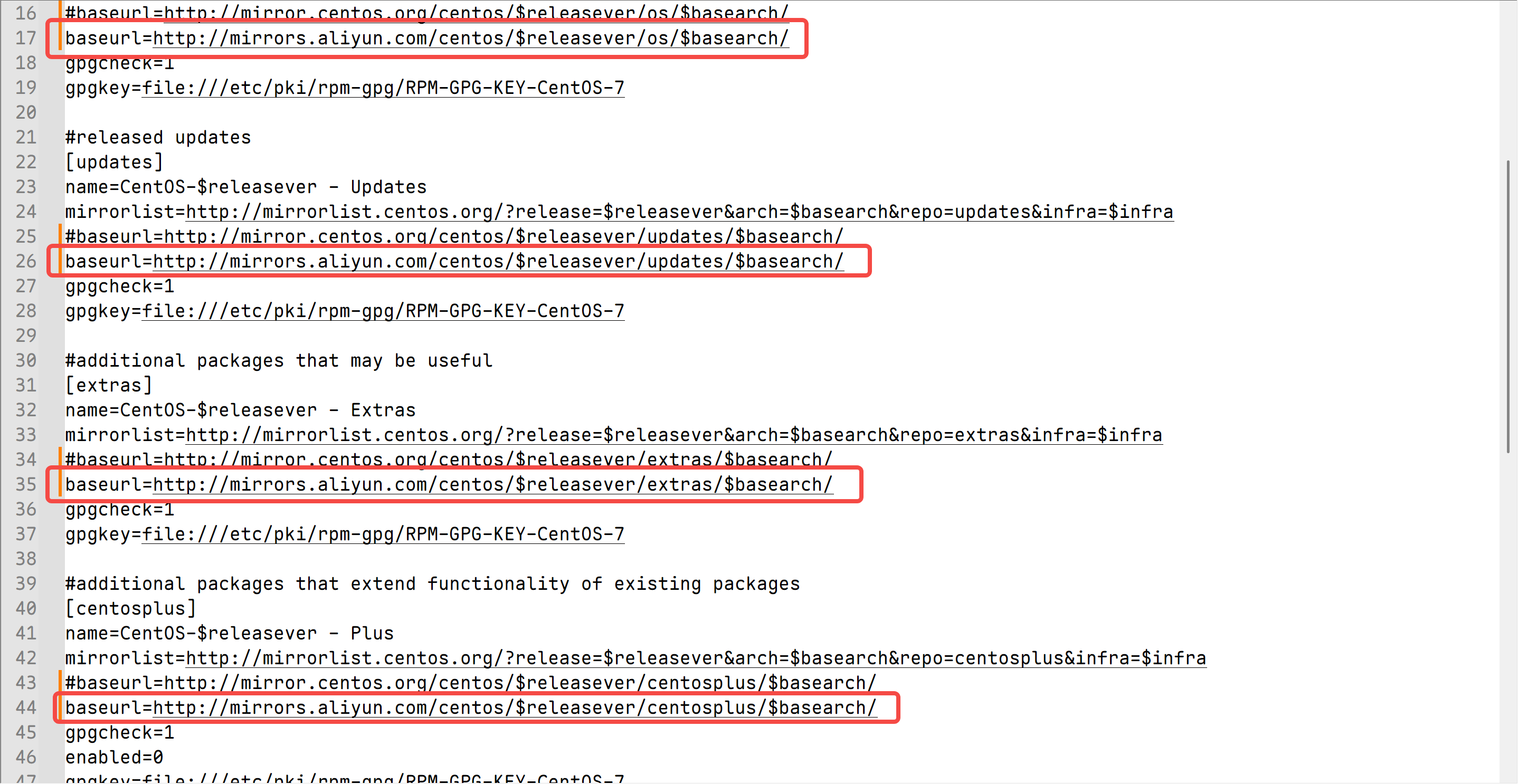 找到 4 个 baseurl,把 # 号去掉,改成阿里云