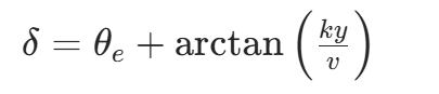 知道了两个偏差,Stanley 算法用一个公式就能算出小车前轮该转多大角度(转角 δ),让小车纠正偏差、回到路径上。这就是它的核心公式,也是唯一需要记住的公式: