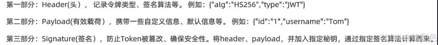 JWT令牌由三部分组成,分别是头部(Header)、载荷(Payload)和签名(Signature)。头部包含了令牌使用的加密算法信息,载荷包含了所需传输的用户信息,签名用于保证令牌的完整性和真实性,防止令牌被篡改。