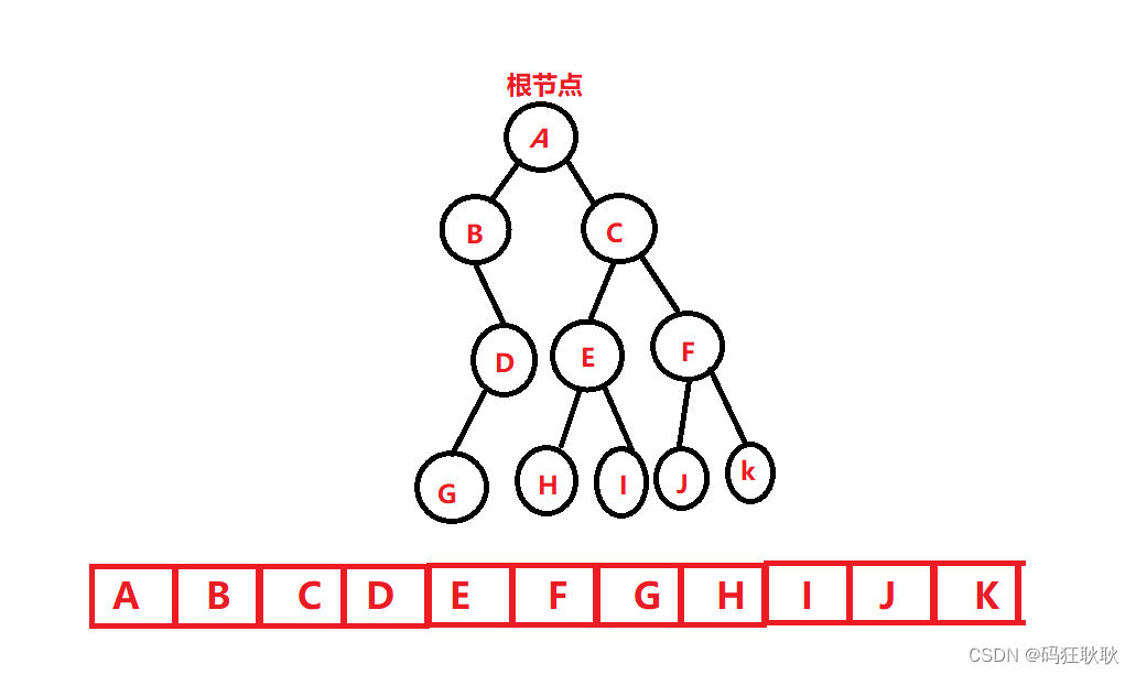 前序遍历:首先是遍历根结点A,然后看左子树,我们便找左子树的根结点B,然后看B的左子树,发现B没有左子树,那么我们看右子树,遍历B的右子树的根结点D,然后遍历G,发现子树D没有右子树,这个时候A的左子树遍历完了,然后是右子树C,同理我们遍历后的结果为CEHIFJK