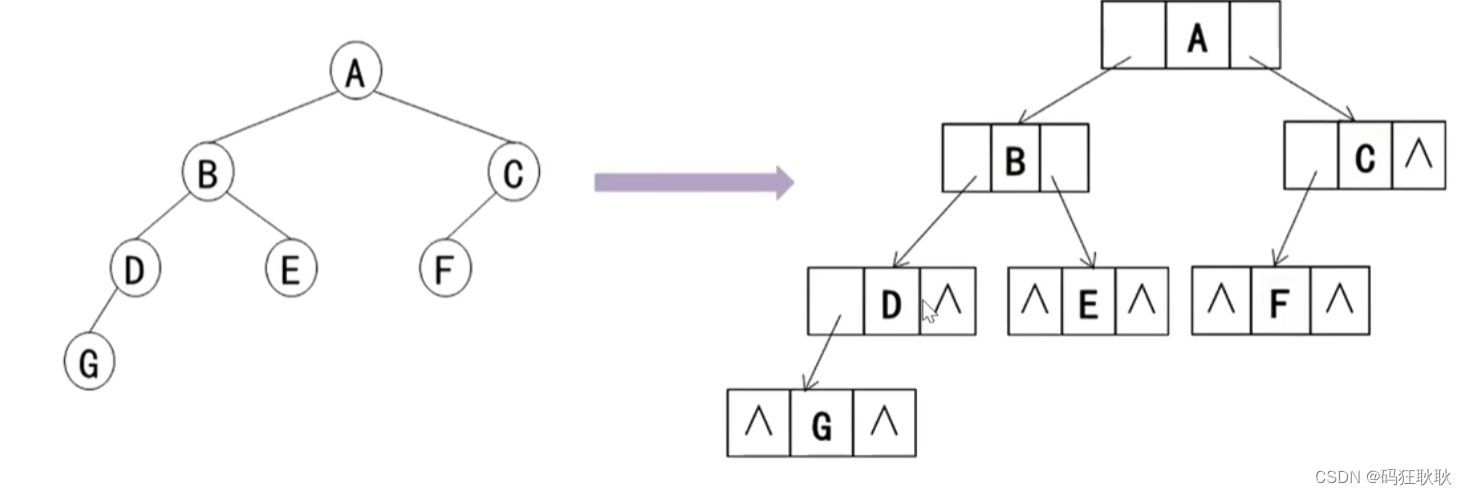 链式储存:二叉树的链式储存结构是用一个链表来储存一颗二叉树,二叉树的每一个结点用链表的链结点来储存