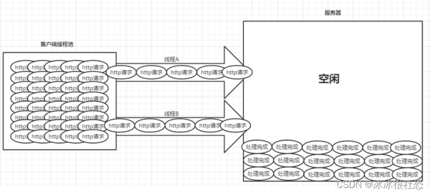 这听起来很扯淡,我们使用的服务器配置动不动就8核16G,为什么发送http请求的能力如此弱鸡,实际上这并不是服务器的锅,也不是java的锅,而是http工作模式的原因,在发送数据和得到数据的过程中有一个等待的过程,等待的过程并不消耗CPU,但是会让当前线程陷入等待,干不了别的事情。如果把多线程转换成线程池的模式,那么使用同步http时,在高并发场景下,线程池的队列中会堆积大量请求任务发不出去,而被请求的目标服务器,却还远没有达到瓶颈。