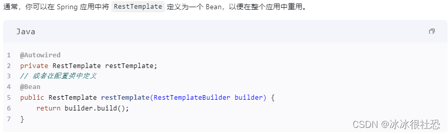 RestTemplate是 Spring 框架提供的一个强大的 HTTP 客户端类,用于从 RESTful Web Service 发送同步请求并处理响应。它基于模板方法设计模式,简化了与 HTTP 服务的交互,支持 GET、POST、PUT、DELETE 等 HTTP 方法。下面是RestTemplate的一些基本用法示例: