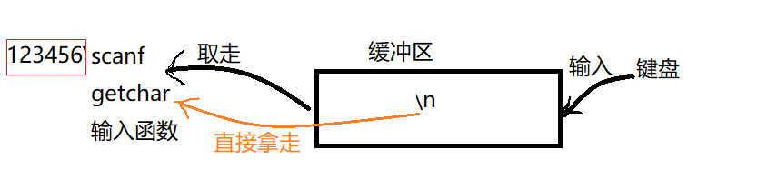 输入函数先来看缓冲区中是否有数据,如果有,它直接就拿走了,不需要从键盘输入,如果缓冲区什么都没有,则需要从键盘输入,再拿走。