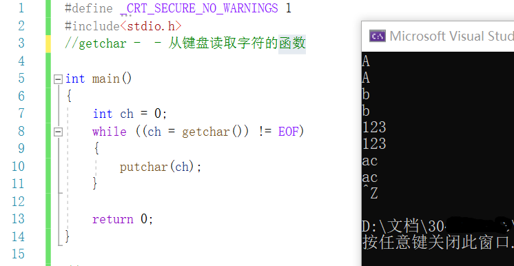 getchar先读取一个字符放到ch里面去,如果这个字符不等于EOF,就进入循环,打印这个字符。当getchar读到文件末尾或者结束时,它会返回一个EOF,此时结束循环。
