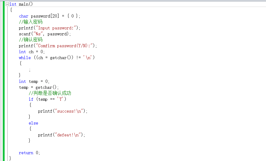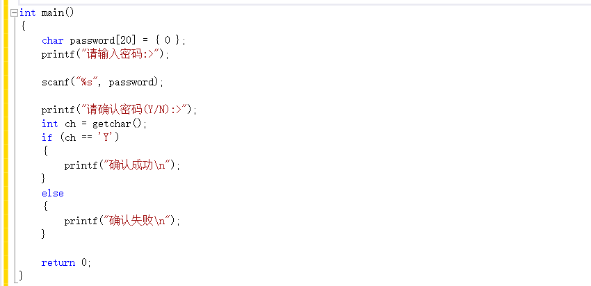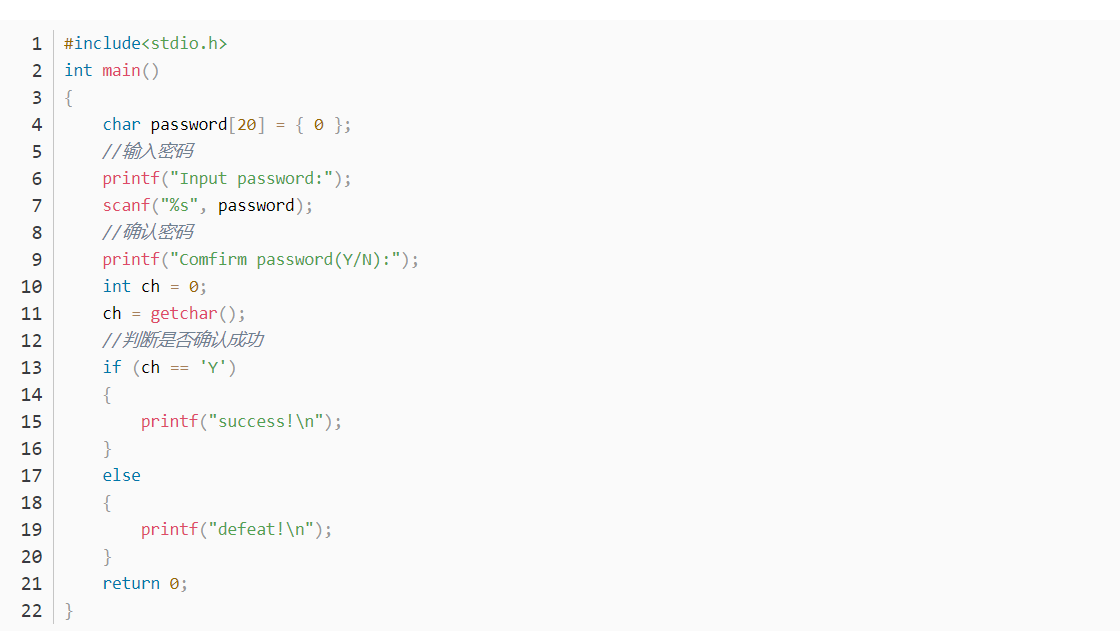 那我们怎么改进,让字符 ‘Y’ 或者 ‘N’ 得以被接收呢,猜你已经想到了,那就是在 ch = getchar(); 语句前面增加一条 getchar(); 语句,来读取处理掉 ‘\n’ ,这样用来确认密码的那个 getchar 函数就可以接收字符 ‘Y’ 或者 ‘N’ 了