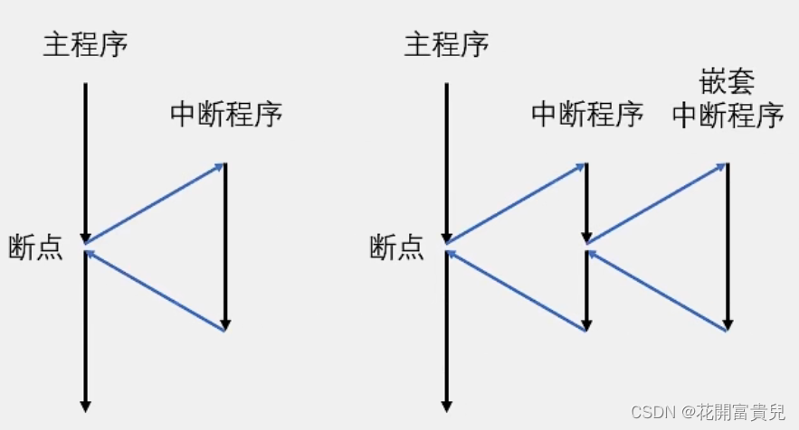 - 中断嵌套:当一个中断程序正在运行时,又有新的更高优先级的中断源申请中断,CPU再次暂停当前中断程序,转而去处理新的中断程序,处理完成后依次进行返回