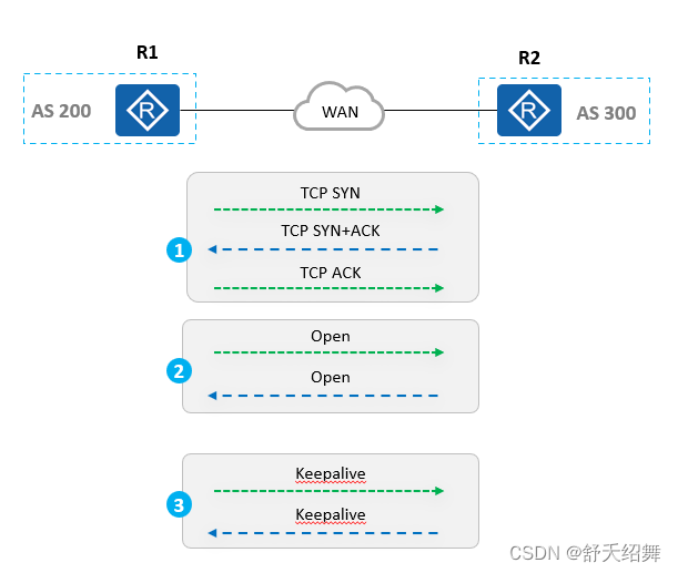 三次握手建立完成之后,R1、R2之间相互发送Open报文,携带参数用于对等体建立,参数协商正常之后双方相互发送Keepalive报文,收到对端发送的Keepalive报文之后对等体建立成功,同时双方定期发送Keepalive报文用于保持连接。(你发tcp连接,我收到,我收到给你回我的,TCP建立完毕,然后互发open,Keepalive,都成功之后对等体建立完毕)